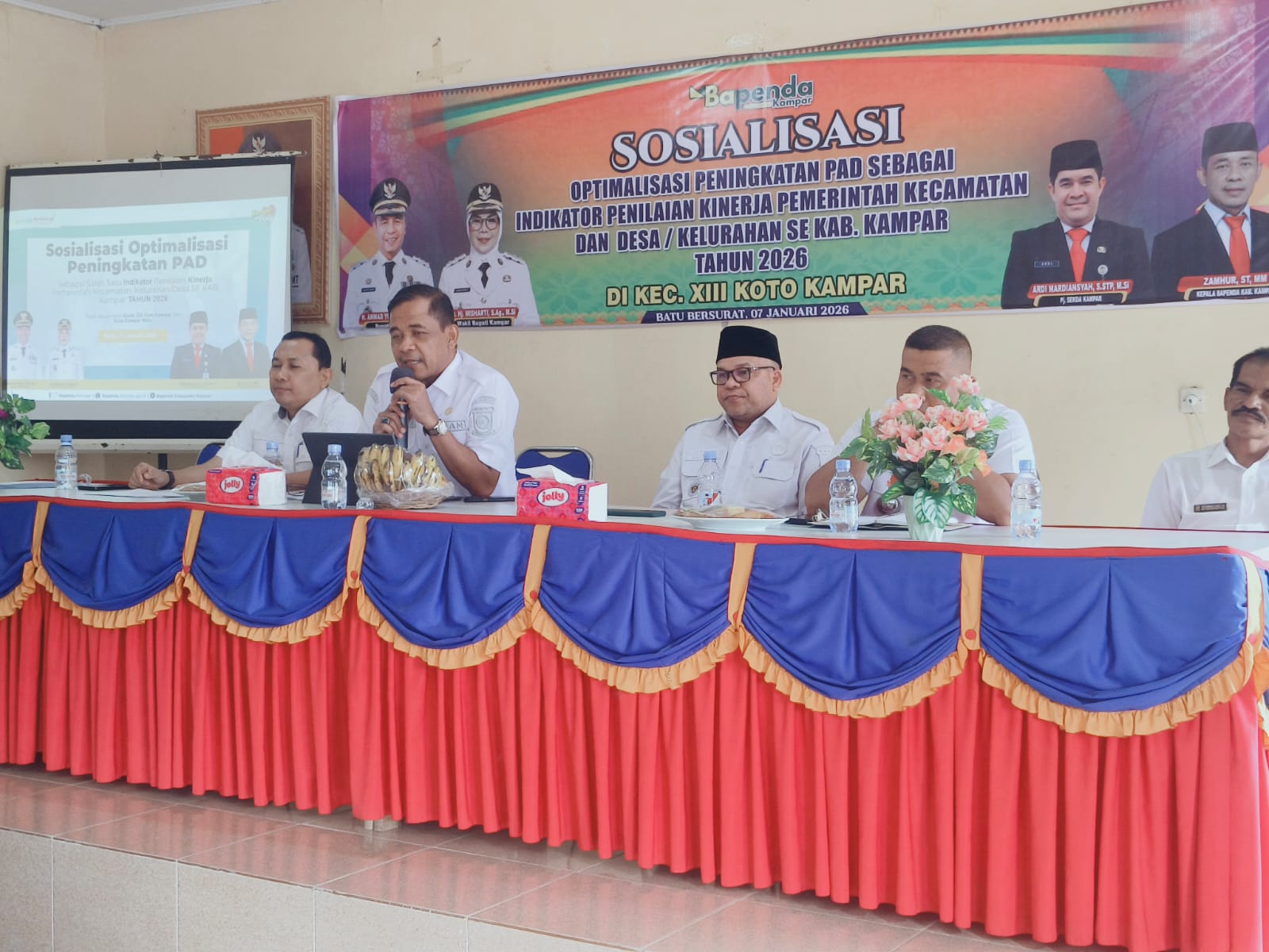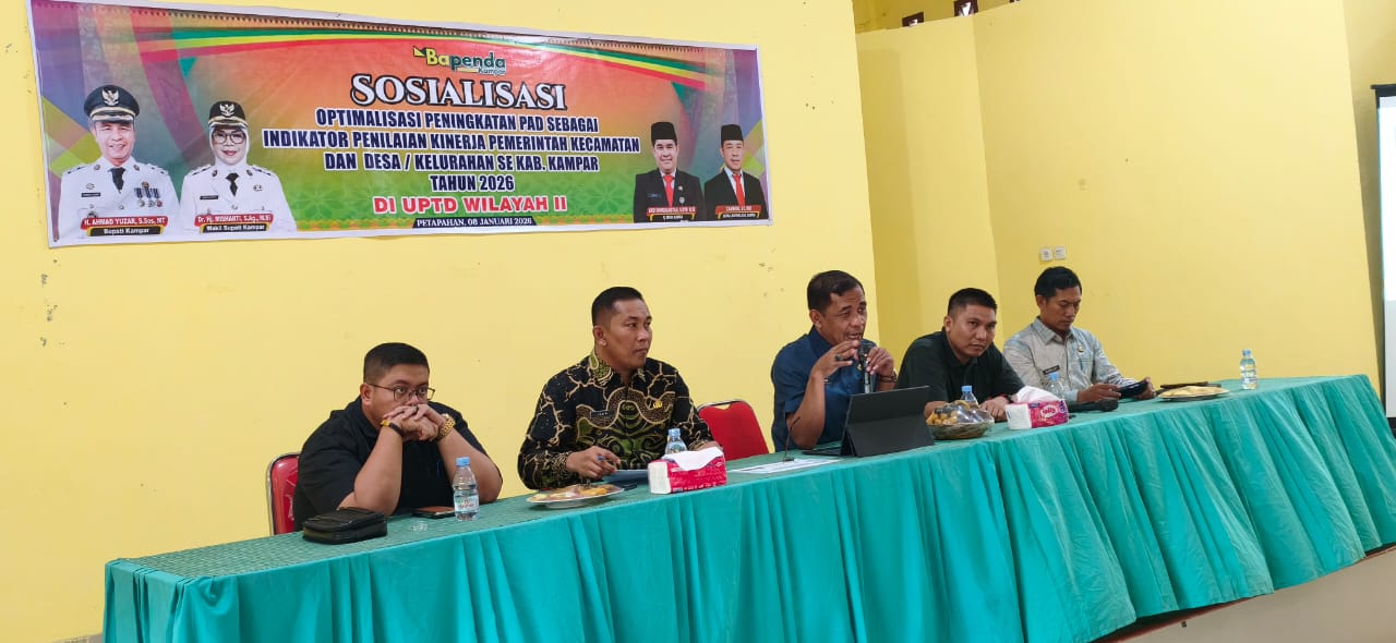 Badan Pendapatan Daerah (Bapenda) Kabupaten Kampar menggelar Sosialisasi Optimalisasi Peningkatan Pendapatan Asli Daerah (PAD) sebagai Salah Satu Indikator Penilaian Kinerja Pemerintah Kecamatan, Kelurahan, dan Desa se-Kabupaten Kampar Tahun 2026. Kegiatan ini merupakan bagian dari upaya strategis Pemerintah Kabupaten Kampar dalam memperkuat peran kecamatan, kelurahan, dan desa guna meningkatkan kepatuhan serta optimalisasi penerimaan pajak daerah.