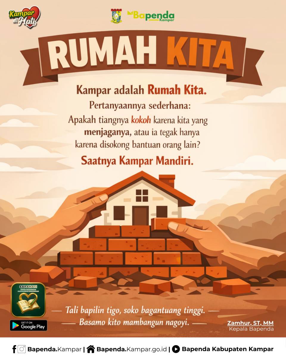 Bagi saya, Kampar adalah sebuah rumah, Rumah Kita. Rumah besar tempat bernaung ratusan ribu jiwa. Pertanyaannya sederhana, bagaimana kabar rumah kita ini? Apakah tiangnya masih kokoh karena kita yang menjaganya, atau ia berdiri tegak hanya karena disokong bantuan dari pusat.