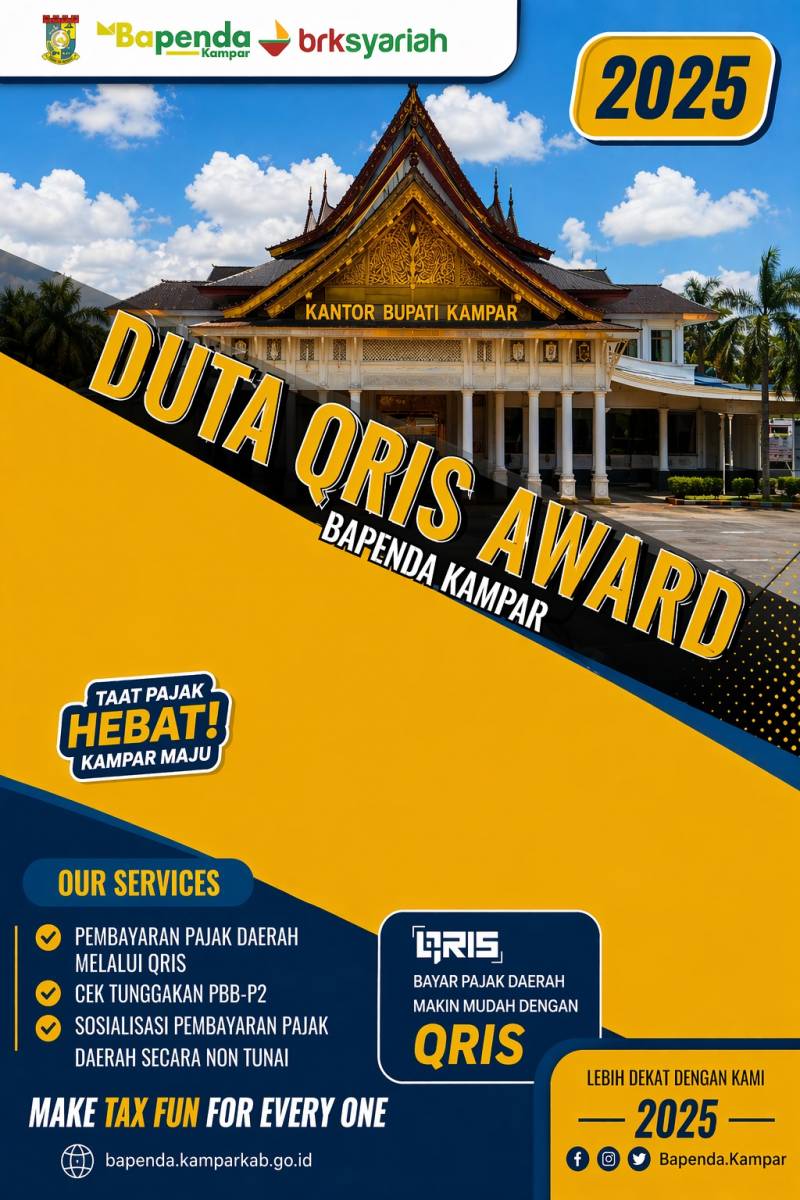 KAMPAR, 14 Juli 2025 – Dalam upaya mewujudkan modernisasi sistem administrasi perpajakan dan mendorong masyarakat beralih ke transaksi digital, Badan Pendapatan Daerah (Bapenda) Kabupaten Kampar berkolaborasi dengan BRK Syariah sukses menyelenggarakan ajang bergengsi "Duta QRIS Award Bapenda Kampar 2025" pada Senin (14/7/2025).